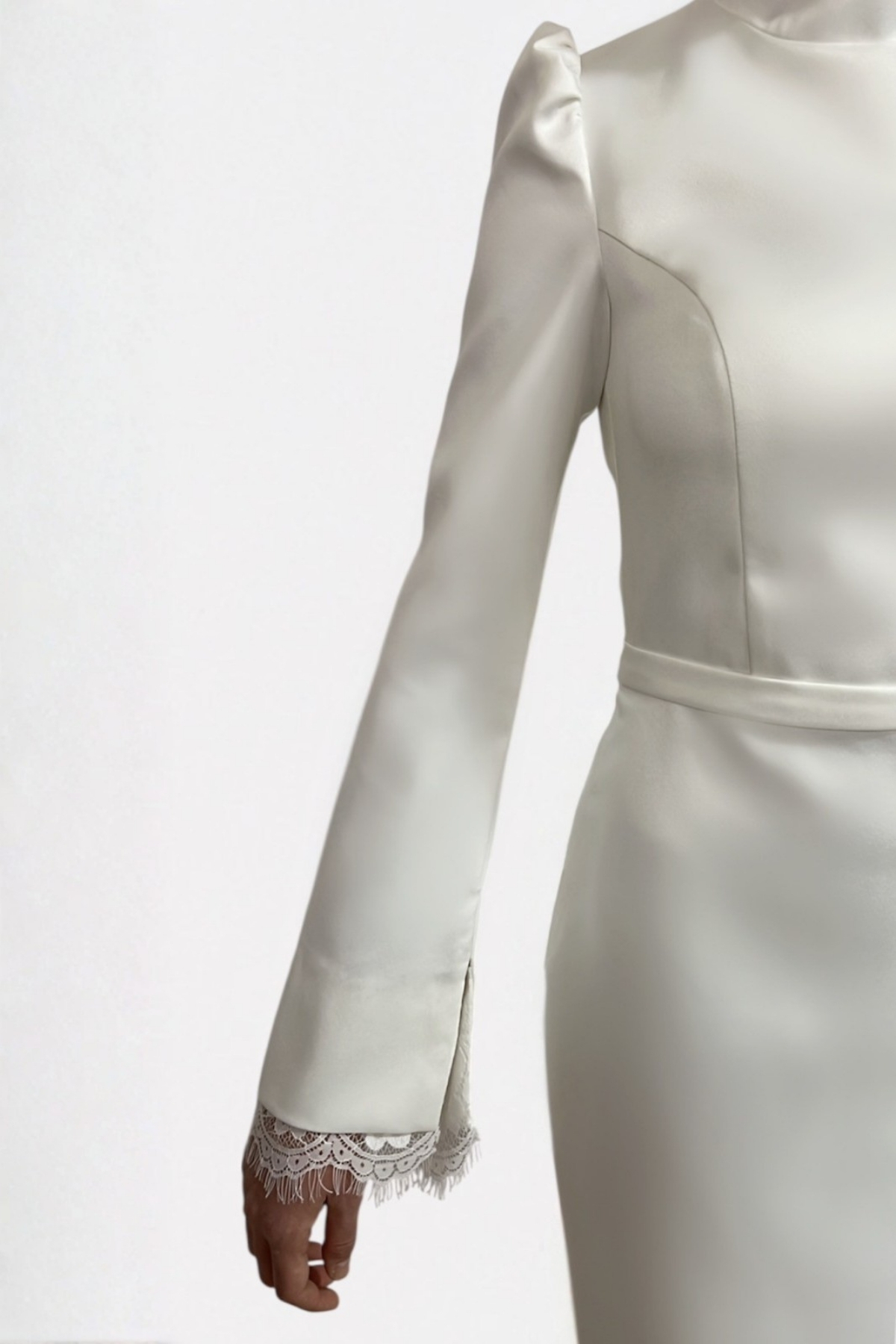 Sade ve zamansız şıklığıyla öne çıkan bu tasarım, mat saten kumaşın zarif dokusunu modern bir siluetle buluşturur. Boğazlı yaka detayı asil bir duruş sunarken, bilekte biten boyu sayesinde dengeli ve sofistike bir görünüm yaratır. Kol uçlarındaki dantel detaylar ise elbiseye romantik ve incelikli bir dokunuş katar.