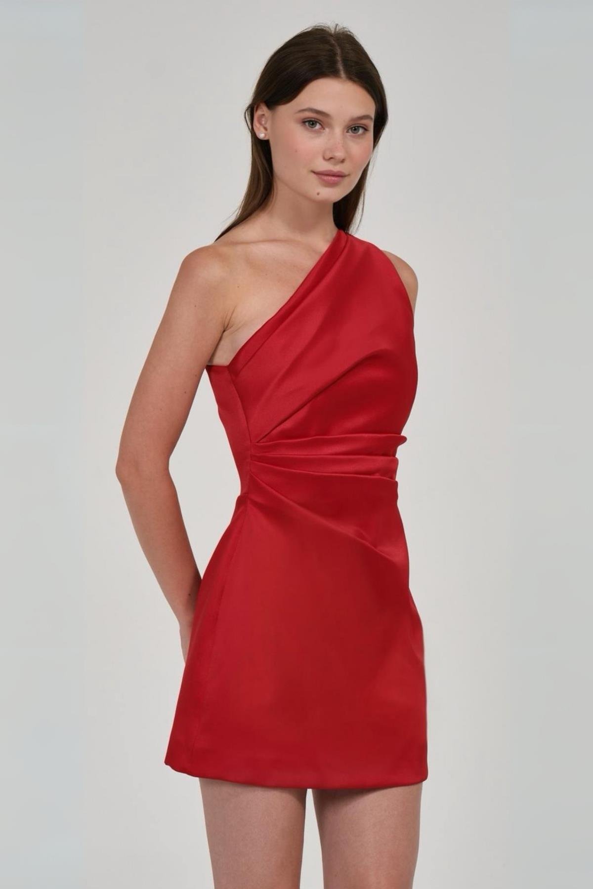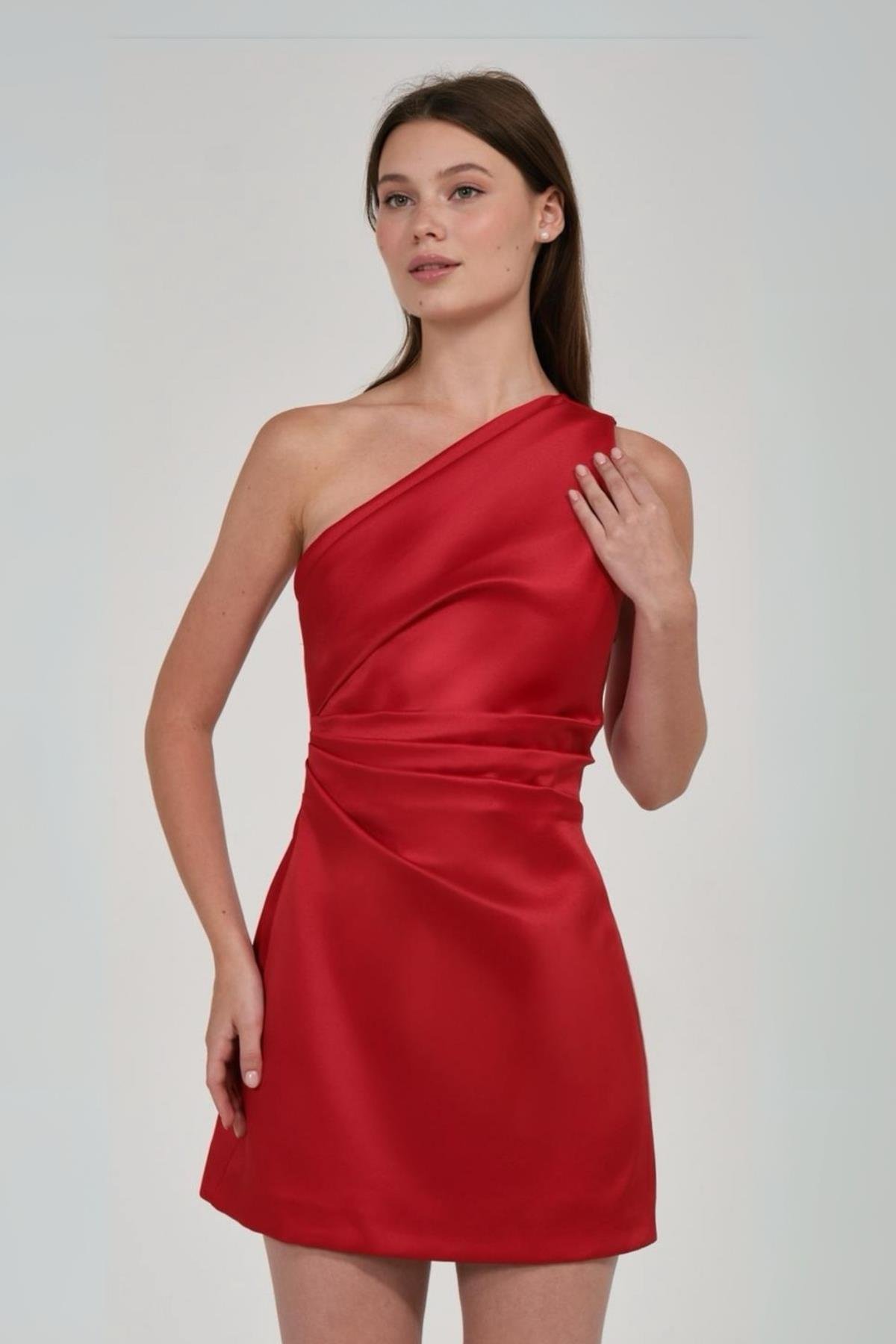 Cesur ve zarif tasarımıyla öne çıkan Eliza elbise, kırmızı rengin etkileyici tonu ve mat saten kumaşıyla göz kamaştırır. Ön kısmındaki kırım detayları modern bir hareket katarken, mini boy tasarımı feminen bir siluet sunar. Kumaş: Mat saten