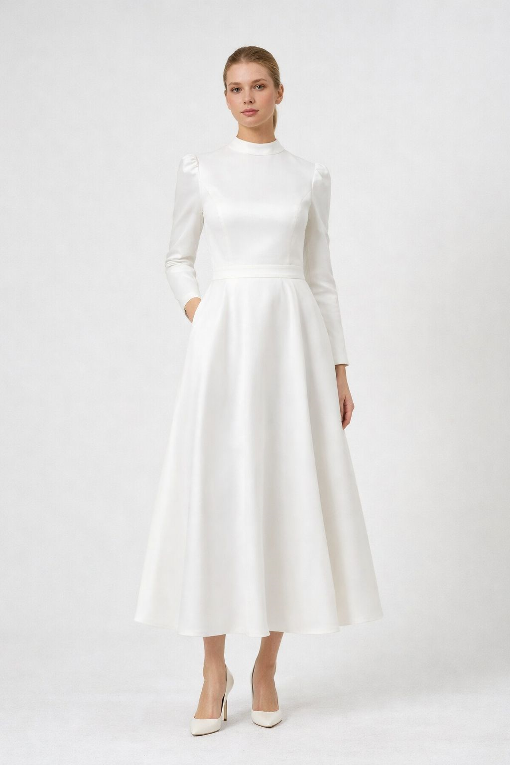 Zamansız ve zarif bir siluet sunan Eloise elbise, mat saten kumaşın sade şıklığını modern bir form ile buluşturur. Uzun kollu tasarımı ve midi boy kesimiyle dengeli bir görünüm sunarken, arkadaki kurdele detayı elbiseye romantik ve feminen bir dokunuş katar.